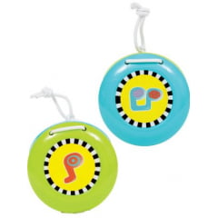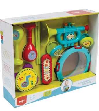 Linha Baby. Contém 10 peças, sendo elas: 1 tambor, nas cores azul e vermelha. 2 baquetas, na cor verde. 2 castanholas, nas cores azul e verde. 2 maracas, nas cores vermelha e verde. 1 pandeiro, nas cores verde e roxa. 1 gaita, na cor vermelha. 1 trompete, nas cores azul e verde. Idade: a partir de 12 meses.