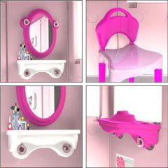 • Com um espelho, uma prateleira em formato de busto, uma penteadeira, uma cadeirinha, dois cabideiros;